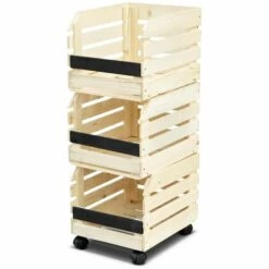 Ce lot de 3 cagettes en bois de pin naturel sera idéal pour stocker vos légumes dans votre arrière-cuisine ! Avec ces trois clayettes, il vous sera facile de séparer vos légumes et les trois ardoises présentes vous permettront de savoir ce que contient chacune d’entre elles. Pour faciliter les déplacements, ces cagettes sont empilables et celle du bas est équipée de 4 roulettes. Vous pouvez également les utiliser séparément selon vos envies. Chaque clayette est ajourée favorisant ainsi une bonne circulation de l’air et respecter le rythme de croissance de vos légumes.<br/>Détails techniques