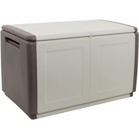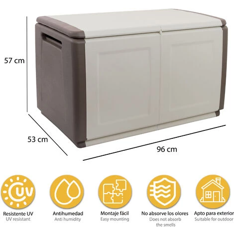 Coffre de rangement en polypropylène, couleur ivoire et marronLes coffres cubiques sont compacts, solides et spacieux. Elles sont idéales pour les maisons, les garages, les jardins, les escaliers, les balcons, à l’intérieur et à l’extérieur de la maison. Système de goutte à goutte, les courbures des éléments facilitent l’écoulement de la pluie sur la structure.Il dispose d’un système de verrouillage (avec cadenas – non inclus).Fabriqué en polypropylène, il ne retient pas l’humidité ni les odeurs.Conçu pour un montage facile.Blanc et brun57x96x53 cm.