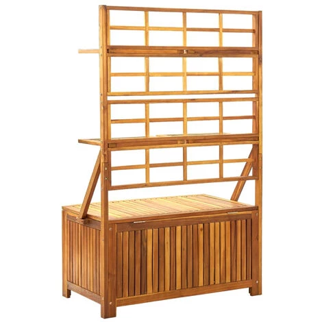 Cette boîte de rangement polyvalente offre de l’espace de rangement et de la place pour vos plantes et vos fleurs. Cette boîte de coussin est fabriquée en bois d’acacia massif, un bois dur avec des grains denses. Cette boîte magnifiquement conçue est stable, durable et accrocheur. Le savoir-faire exquis et les beaux grains de bois rendent chaque pièce légèrement différente l’une de l’autre. Le treillis intégré offre un excellent support pour les plantes grimpantes. Vous pouvez également placer le pot de fleurs sur les étagères. Les 4 étagères incluses peuvent être ajustées en position. Remarque: Afin de prolonger la durée de vie de vos meubles d’extérieur, nous vous recommandons de les nettoyer régulièrement et de ne pas les laisser à l’extérieur sans protection inutilement.Nettoyage : Utiliser une solution savonneuse douceStockage : Si possible, stockez dans un endroit frais et sec à l’intérieur. Si le produit est stocké à l’extérieur, protégez-le avec une housse imperméable. Essuyez et séchez l’excès d’eau ou de neige des surfaces planes après la pluie ou une chute de neige. Permettez une circulation d’air suffisante afin d’éviter les dommages liés à l’humidité.