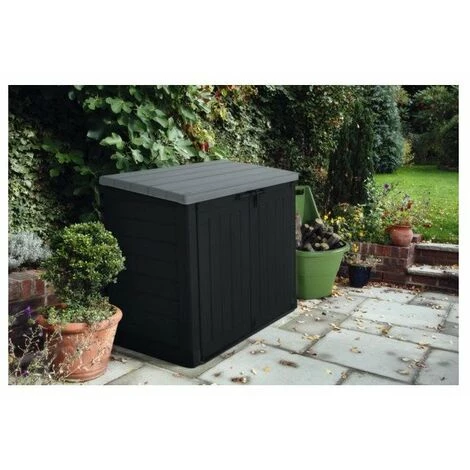 Facile à ouvrir : pistons hydrauliques qui maintiennent le toit du coffre ouvert à la hauteur que l?on souhaite Kit d?ouverture de poubelles fourni qui permet de les ouvrir en même temps que le toit Supports d?étagères intégrés (étagères non incluses) Plancher inclus, pour protéger contre la boue et la pluie Verrouillable (cadenas non inclus)