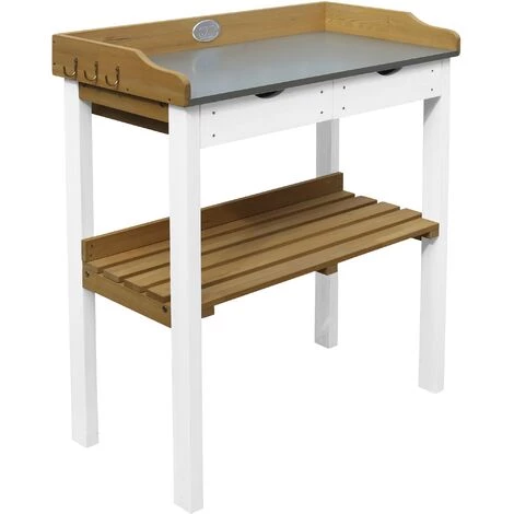 La table de rempotage AXI avec 2 tiroirs et plan de travail de zinc en brun et blanc est un ajout pratique à un jardin ou d’un balcon. Rempotage des fleurs et des plantes devient un jeu d’enfant avec cette table de mise en pot. Le compartiment de stockage offre beaucoup d’espace de stockage supplémentaire pour les plantes, le sol de jardin et des pots de plantes. Merci aux deux tiroirs pratiques, outils de jardinage en vrac et d’autres éléments essentiels peuvent également être bien rangés. Sur le plan de travail, les 6 crochets offrent également la possibilité de ranger des outils comme un râteau ou une pelle. Vos outils de jardin seront toujours à portée de main!