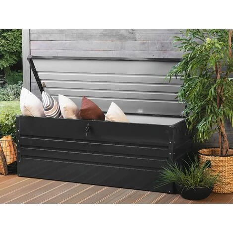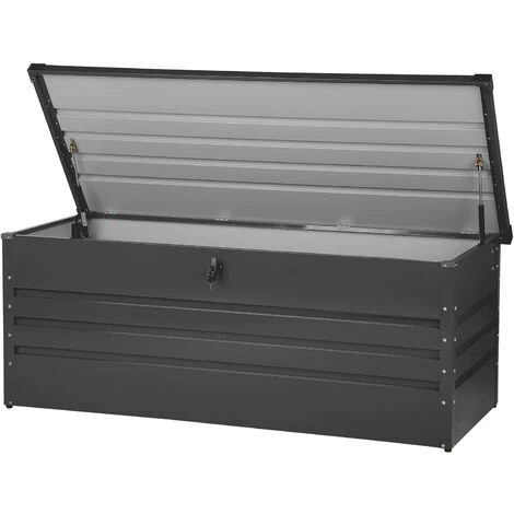 Coffre de jardin 600L gris foncé. Protégez vos accessoires de jardin, vos outils et vos équipements grâce à ce coffre de rangement extérieur. Pour une utilisation optimale ce coffre de jardin de 600 litres est doté d’un vérin, il dispose d’une serrure verrouillable à clé afin de maintenir le contenu en sécurité. Fabriqué en acier gris foncé, il se montre à la fois robuste et élégant.