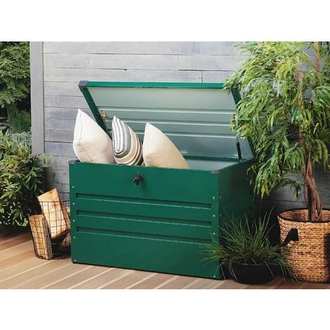 Coffre de jardin en acier vert. Protégez vos accessoires de jardin, vos outils et vos équipements grâce à ce coffre de rangement extérieur. Pour une utilisation optimale ce coffre de jardin de 300 litres est doté d’un vérin, il dispose d’une serrure verrouillable à clé afin de maintenir le contenu en sécurité. Fabriqué en acier vert, il se montre à la fois robuste et élégant.