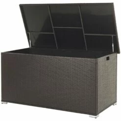 Coffre à coussins élégant en rotin marron. Dans les mois chauds d’été, il n’y a rien de mieux que de passer du temps dans le jardin, sur la terrasse ou sur le balcon aussi souvent que possible. Il vous faudra aussi envisager quelques accessoires necessaire pour le rangement. Ce coffre sera idéal pour stocker vos coussins et autres accessoires de jardin. Il est composé d’une structure en acier et d’un revêtement en rotin PE (résine tressée) de haute qualité offrant un design élégant et moderne. Ce superbe coffre de jardin est équipé de vérins pneumatiques afin de pouvoir l’ouvrir et le fermer en toute simplicité.