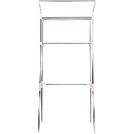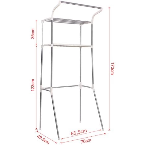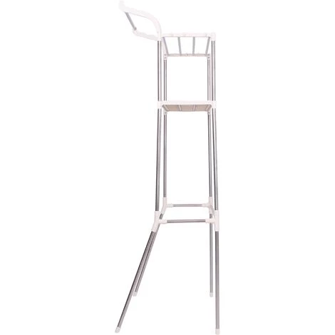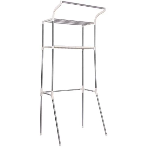Positionnée au dessus d’un lave-linge, cette étagère, en tube d’acier, vous offre deux niveaux de rangement et une tringle de suspension pour les vêtements. Ces niveaux de stockage se composent chacun de quatre tubes horizontaux. Avec l’élément d’étagère en douze parties, une surface de stockage continue et plate peut être créée sur laquelle, par exemple, des détergents ou autres produits nécéssaires pour le lavage peuvent être disposés. Ces douze composants en plastique peuvent également être placés au niveau supérieur de l’étagère (hauteur d’étagère réglable). De plus, il y a trois crochets de chaque côté, sur lesquels vous pouvez accrocher des serviettes, des chiffons de nettoyage ou autres.
