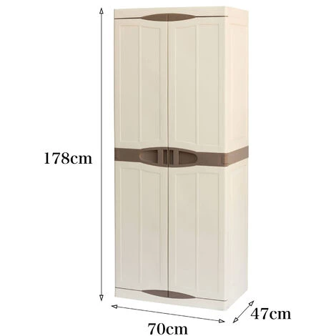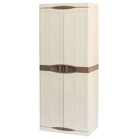 ARMOIRE – Armoire à balais – ARMOIRE – Armoire à balais avec deux portes et quatre étagères réglables avec structure surélevée sur pieds, entièrement de couleur beige.