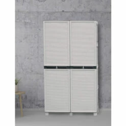 ARMOIRE – Armoire à balais – ARMOIRE – Armoire à balais avec deux portes et trois étagères sur le côté droit avec structure surélevée sur pieds, entièrement de couleur gris clair.
