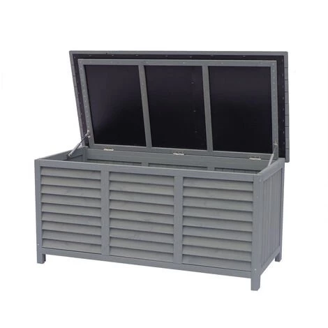 Coffre de jardin en bois « Macao » – 500 Litres – 130 x 64 x 60 cm – En bois de sapin – Mettez à l’abri votre matériel – Supporte jusqu’à 30 kg – AnthraciteCoffre de jardin en bois « Macao » Des rangements dans le jardin Le coffre de jardin Macao vous propose un véritable espace de rangement dans votre jardin. D’une capacité de stockage de 500L, ce coffre peut être utilisé pour y ranger vos housses de mobilier de jardin, vos coussins de jardin, les jouets des enfants ou encore vos petits matériels de bricolage et de jardinage.