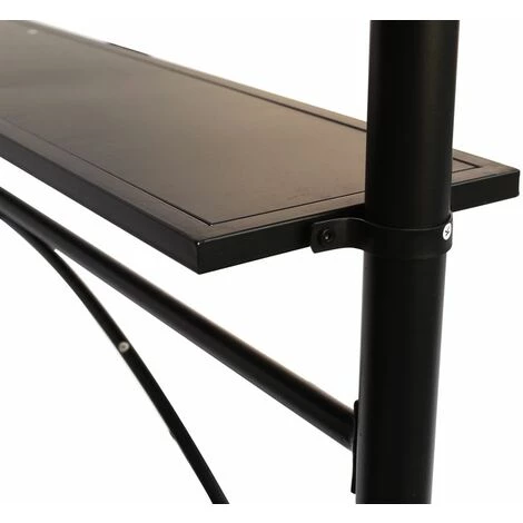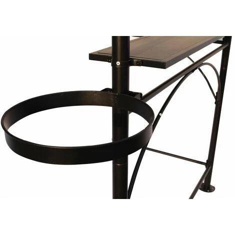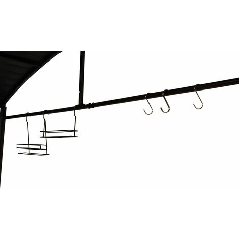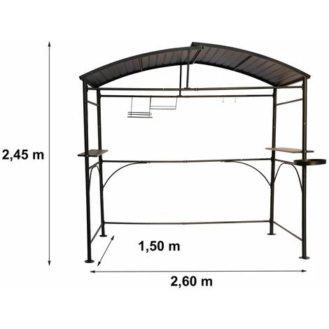 Carport barbecue en acier finition époxy gris anthracite avec toit en acier galvanisé dimensions l 2,60 m x P 1,50 m x H 2,45 m livré avec 4 pieds réglables à rattrapage de niveau, 2 tablettes sur le côté 140x25x2 cm, une étagère pour condiments, une étagère porte essuie-tout, une patère porte tablier de cuisine, 5 crochets pour ustensiles de cuisson, support de sac poubelle à fixer sur le carport barbecue.