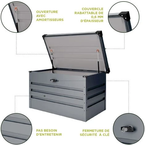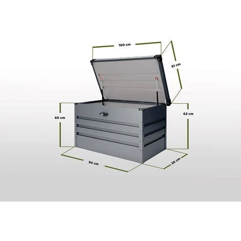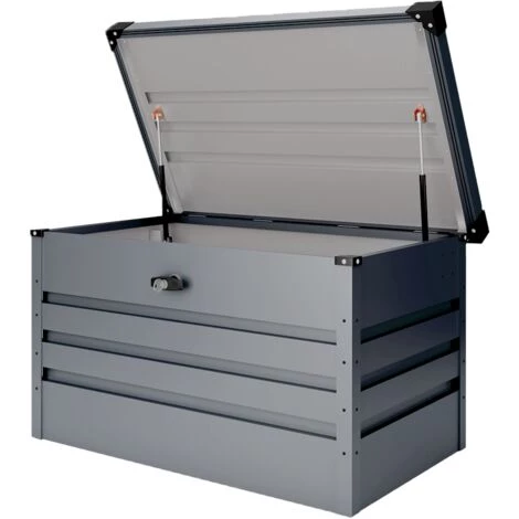 Coffre métallique Aarhus d’une capacité de 300 litres. Fabriqué en panneaux d’acier galvanisé de 0,40 mm d’épaisseur (0,60 mm dans le couvercle), ce qui lui confère une grande solidité et robustesse. Design gris anthracite élégant.
