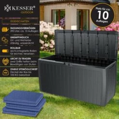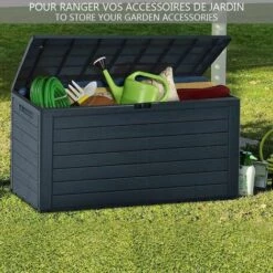 Cette boîte à coussins de jardin en résine tressée est un choix idéal pour ranger des coussins, des oreillers, des couvertures supplémentaires, des serviettes, des bibelots et bien plus encore. Cette boîte de rangement de jardin a un cadre robuste en acier enduit de poudre, qui est très durable. Grâce à la résine tressée résistante aux intempéries, le coffre de rangement est facile à nettoyer, résistant à l’usure et adapté à une utilisation à l’extérieur ainsi qu’à l’intérieur. De plus, le sac d’intérieur imperméable en PE avec housse et fermeture éclair protège vos articles de l’humidité. De plus, la boîte à coussins est dotée d’un mécanisme de levage à gaz qui facilite son ouverture et sa fermeture, protégeant ainsi les doigts et les mains d’une fermeture accidentelle. Remarque : Afin de prolonger la durée de vie de vos meubles d’extérieur, nous vous recommandons de les nettoyer régulièrement et de ne pas les laisser à l’extérieur sans protection inutilement.Nettoyage : Utiliser une solution savonneuse douce.Stockage : Si possible, stockez dans un endroit frais et sec à l’intérieur. Si le produit est stocké à l’extérieur, protégez-le avec une housse imperméable. Essuyez et séchez l’excès d’eau ou de neige des surfaces planes après la pluie ou une chute de neige. Permettez une circulation d’air suffisante afin d’éviter les dommages liés à l’humidité.