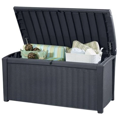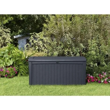 Ce panier de rangement de qualité Borneo de Keter avec son aspect élégant en osier/rotin convient pour ranger toutes sortes de choses et peut également servir de siège pour 2 adultes. Le panier possède une contenance de 416 L, et sa construction durable et résistante aux intempéries garantit que son contenu restera sec et aéré.
