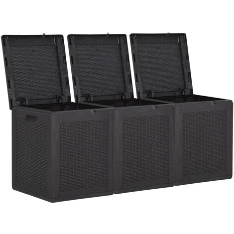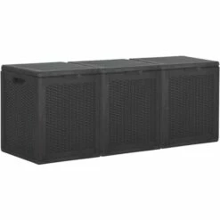 Cette boîte de rangement simple est une excellente solution pour désencombrer votre jardin, patio ou terrasse. Le coffre de rangement est fabriqué en matériau 100 % PP, ce qui le rend résistant aux intempéries, aux UV, léger et facile à déplacer. La boîte de rangement de jardin présente un design discret mais intemporel et s’intègre parfaitement à votre décor intérieur et extérieur. De plus, la boîte de rangement de jardin offre un grand espace de rangement pour les coussins, les oreillers et autres articles de ménage ou de jardin à portée de main. Remarque : Afin de prolonger la durée de vie de vos meubles d’extérieur, nous vous recommandons de les nettoyer régulièrement et de ne pas les laisser à l’extérieur sans protection inutilement.Nettoyage : Utiliser une solution savonneuse douce.Stockage: Si possible, stockez dans un endroit frais et sec à l’intérieur. Si le produit est stocké à l’extérieur, protégez-le avec une housse imperméable. Essuyez et séchez l’excès d’eau ou de neige des surfaces planes après la pluie ou une chute de neige. Permettez une circulation d’air suffisante afin d’éviter les dommages liés à l’humidité.Couleur : noirMatériau : 100 % PP (polypropylène)Dimensions : 118,5 x 44,5 x 51 cm (l x P x H)Capacité : 270 LRésistance aux intempériesRésistance aux UVL’assemblage est requisNous ne livrons pas en Corse.