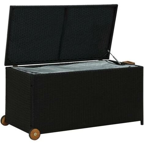 Cette bo?te de rangement de jardin est une solution parfaite pour désencombrer votre jardin, patio ou terrasse. Fabriqué en résine tressée durable et résistante aux intempéries, le coffre est parfait pour une utilisation intérieure et extérieure. Cette bo?te à coussins convient pour ranger vos coussins, oreillers, couvertures, jouets et autres articles. La poignée en bois à finition à l’huile et un sac imperméable intérieur protègent vos articles de l’humidité. La bo?te de terrasse est con?ue avec 2 roues et une poignée d’un c?té pour faciliter le transport. De plus, elle est facile à nettoyer avec un chiffon humide. Remarque : veuillez couvrir la bo?te à coussins par un tissu / un matériau imperméable pour empêcher la pluie d’entrer dans la bo?te s’il pleut.