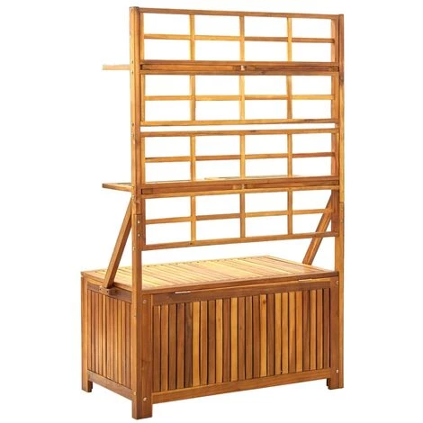 Cette boîte de coussin est fabriquée en bois d’acacia massif, un bois dur avec des grains denses. Cette boîte magnifiquement conçue est stable, durable et accrocheur. Le savoir-faire exquis et les beaux grains de bois rendent chaque pièce légèrement différente l’une de l’autre. Le treillis intégré offre un excellent support pour les plantes grimpantes. Vous pouvez également placer le pot de fleurs sur les étagères. Les 4 étagères incluses peuvent être ajustées en position.